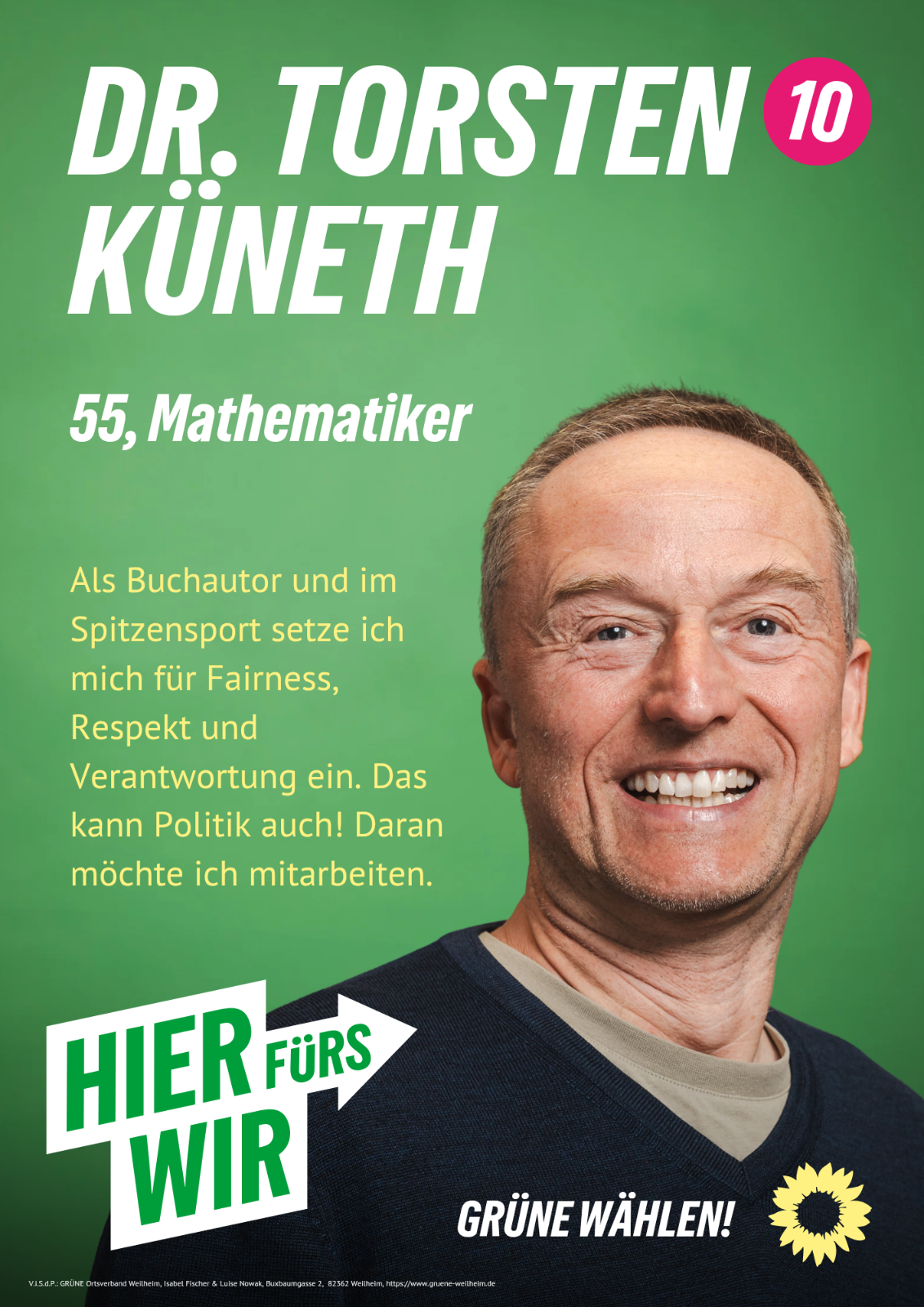 Wählen Sie mich, wenn für Sie Menschenwürde, ein verantwortungsbewusster Umgang mit unserer Gesellschaft und unseren natürlichen Ressourcen sowie eine Kultur von Miteinander, Rücksicht und gemeinsamem Möglichmachen im Vordergrund stehen. Denn mit gemeinsam meine ich nicht nur zwischen den demokratischen politischen Parteien, sondern ich meine uns alle - uns Weilheimerinnen und Weilheimer!